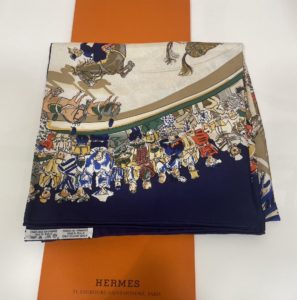 お持ち込みいただいたのは、エルメスらしい馬モチーフが描かれた華やかなデザインの一枚。落ち着いたネイビーを基調に、エルメスの世界観を感じさせるストーリーデザインが映える逸品でした。付属品としてオレンジの専用箱も揃っており、保管状態の良さも感じられるお品でした。
