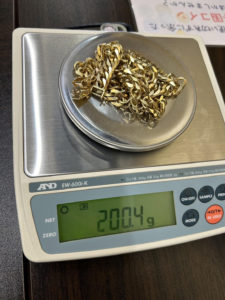 当店の精密秤にて200.4gを計測し、純度確認、カット数の目視チェック、留め具の状態などを丁寧に査定させていただきました。