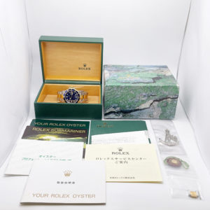 鮮やかなブルーのベゼル、イエローゴールドの輝きが際立つ一本で、ロレックスの中でも存在感のある“通称・青サブ”として人気の高いモデルです。